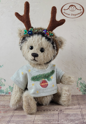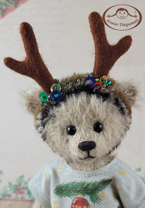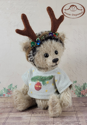 Hedgehog Rudi is shaded. He wears a Christmas jumper. The antlers are decorated with colorful, sparkling pearls and sequins. |