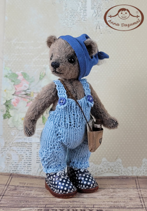 Benny ist ein wenig schattiert. Sein Strickanzug ist gemütlich und warm. Mit seinen blauen Lederschuhen kann er alleine stehen. |