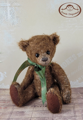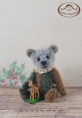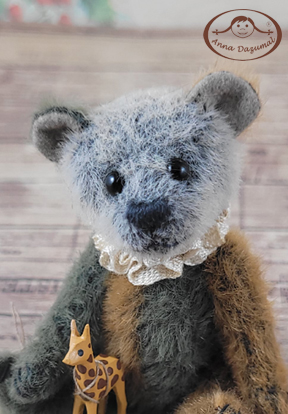 He´s made of Long Pile in a wonderful combination of warm color: grey-brown, green and rust. He has black German glass eyes, a stitched nose and is 5-way jointed.