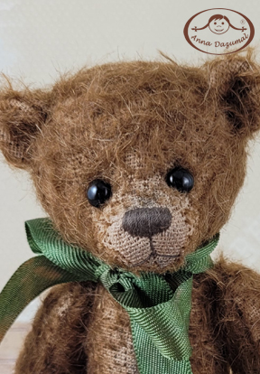 Er ist aus Long Pile in graubraun, grün und rost. Er hat schwarze Glasaugen, eine gestickte Nase, Füllung: Stopfwolle,