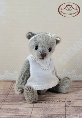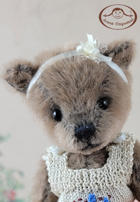 Teddy girl Leona is made of LongPIle in grey brown. Filled with fiberfill and steel pellets for a better weight. She has black German glass eyes and a stitched nose.