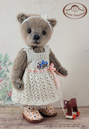 Karlotta ist etwas schattiert. Ihre niedliche Schürze ist mit antiker Spitze und winzigen Herzen verziert. Auch wenn sie etwas schüchtern wirkt, ist sie ein sehr aufgewecktes Bärenkind. |