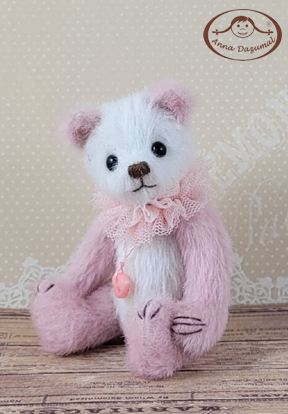 Panda Luise is made of LongPIle in pink and white. Filled with fiberfill and steel pellets for a better weight. She has black German glass eyes and a stitched nose.