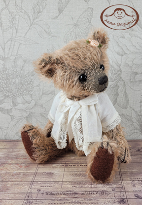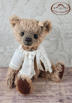 Rosanne is made of Mohair in antique warm brown. Hand and feet are made of felt in a suitable color. Filled with fiberfill and mineral pellets for a better weight. She has black German glass eyes and a stitched nose.