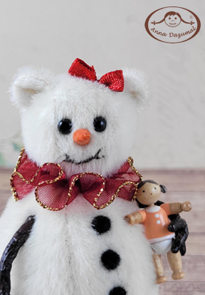 Snowina is made of Long Pile in a wonderful cream color. She has black German glass eyes and a carrot nose. Her head is jointed, Filling: Fiber fill, arms are turnable.