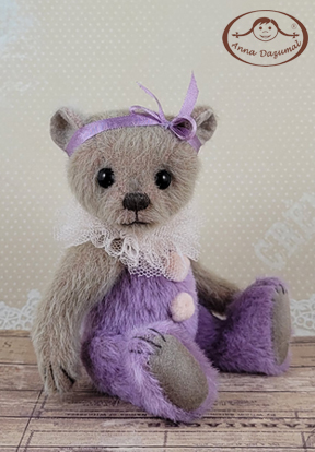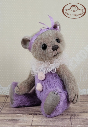 Teddy Thelma is made of LongPIle in brown and lilac. Filled with fiberfill and steel pellets for a better weight. She has black German glass eyes and a stitched nose.