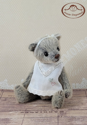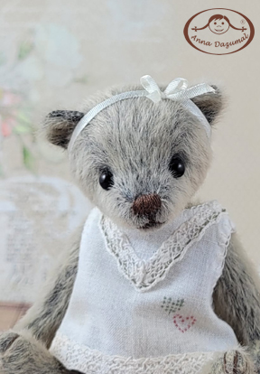 Teddy girl Leona is made of LongPIle in grey brown. Filled with fiberfill and steel pellets for a better weight. She has black German glass eyes and a stitched nose.