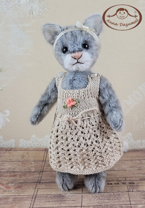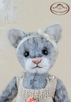 This is amazing Cat Holly, made of Long Pile in 2 amazing colors: main in grey, the inner ears are white. She has black German glass eyes and a stitched nose. Filling: Fiber fill and steel pellets for a better weight, 5 way jointed. The tail is wired and bendable.