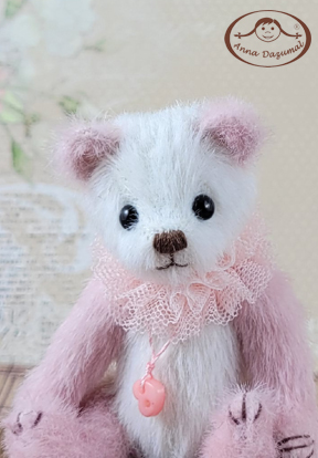 Panda Luise is made of LongPIle in pink and white. Filled with fiberfill and steel pellets for a better weight. She has black German glass eyes and a stitched nose.