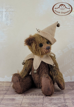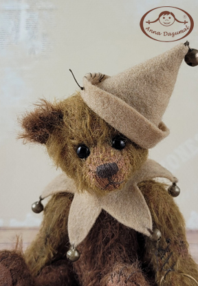 Matteo is made of felted Mohair in beige and brown.Filled with fiberfill and mineral pellets for a better weight, 5 way jointed. He has black German glass eyes and a stitched nose.