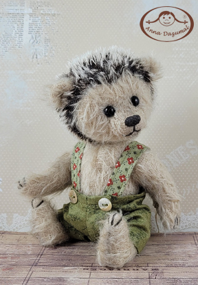 Finn ist aus Antikmohair in einer schönenbraunen Farbe. Hände und Füße sind aus passendem Filz. Er hat schwarze Glasaugen und eine gestickte Nase. Füllung: Stopfwolle und Stahlgranulat. Er kommt mit einem Zertifikat, in dem Namen und Geburtsdatum stehen.