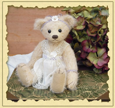 | Graziella ist wie der Name schon sagt ein sehr zartes Bärenwesen. Mit Ihrem wunderschönem cremefarbenen Kleid mit viel Spitze wirkt sie wie aus einem anderen Jahrhundert. Die zartlilafarbenen Akzente unterstreichen Ihren Charme. |
