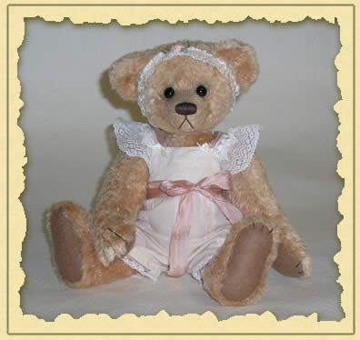 Ihr Fell ist aus Seide. Es hat eine alte Optik und erinnert so an die Künstplüschbären. Also an eine Zeit, wo Mohair rar war. Nur ist es viiiel weicher. Sie ist nur leicht schattiert, denn zum Zupfen ist der Seidenplüsch zu kostbar.