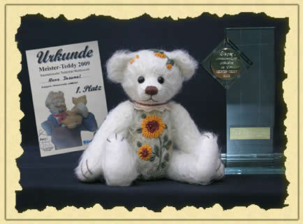 Holly hat auf Ihrem kleinen Bäuchlein eine Sonnenblume mit Hand aufgestickt. In Neustadt/Coburg hat sie in der Kategorie Miniaturbär unbekleidet den 1. Platz beim Meisterteddy 2009 gewonnen. |